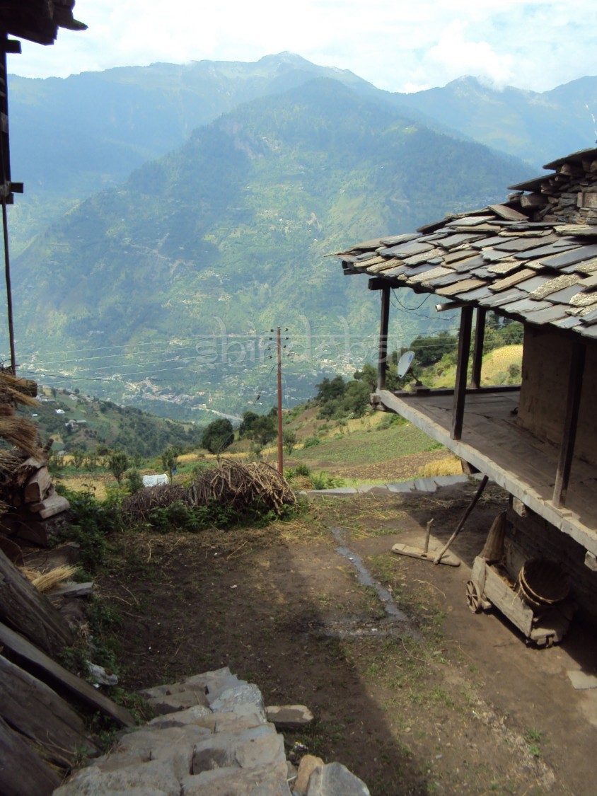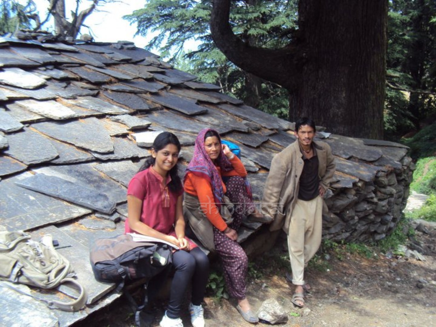 There is no physical road to the village, the village of Jana is purely a pedestrian village. Hence, we had to climb down every morning after breakfast fully equipped with sketchbooks, pens, pads, measuring tapes and cameras! The hike was around 10 minutes but was pleasant as we walked through huge deodar (Cedrus deodara) trees which were 15-20m high and had a trunk base of about 3-5m. This also happened to be the sacred tree of Jana.